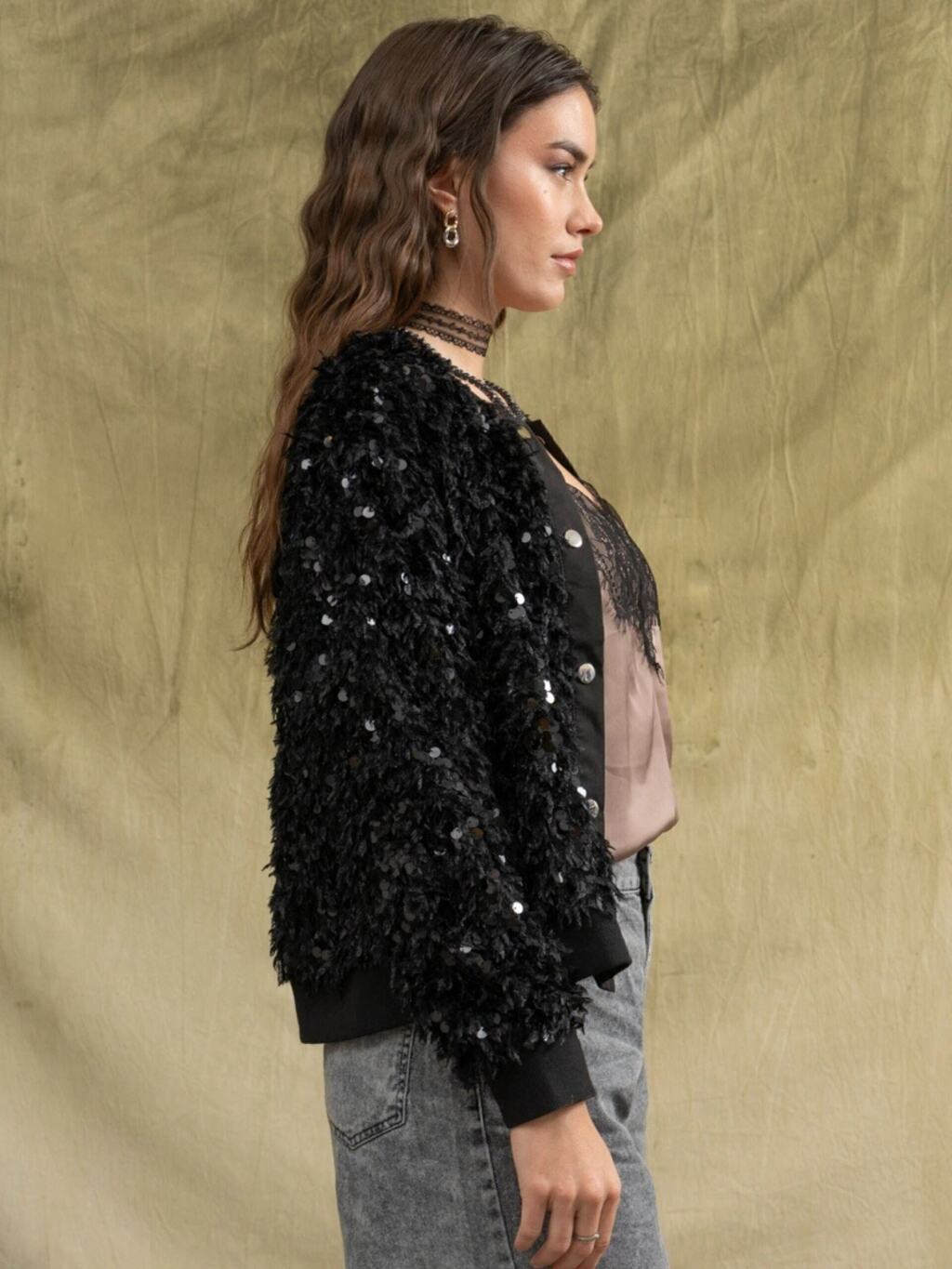 Brillo y suavidad en una sola prenda. Esta bomber mezcla lentejuelas con pelo sintético para lograr un efecto de textura súper canchero que levanta cualquier look al instante. Está completamente forrada, así que se siente suave al contacto con la piel y es comodísima de usar.