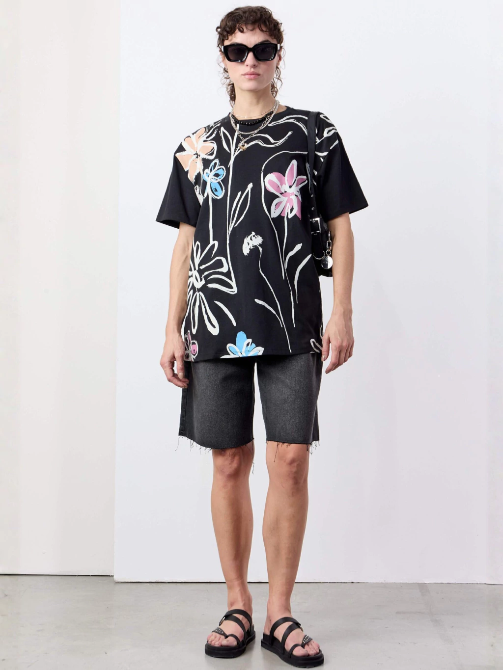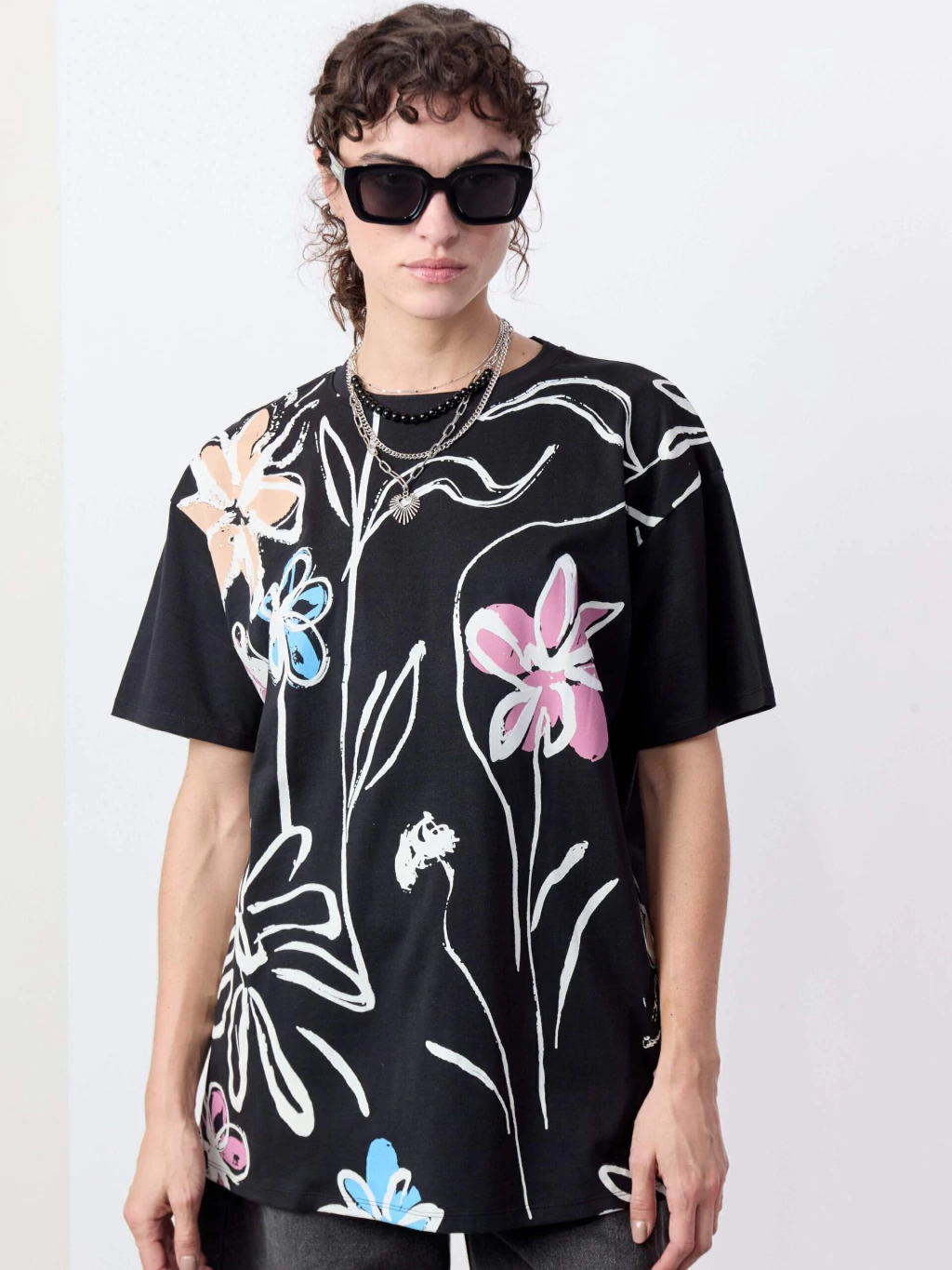 Confeccionada en algodón liviano, esta remera se destaca por su estampado floral colorido de trazo artístico que suma frescura y personalidad al look. Presenta cuello redondo, mangas cortas, chapita marcaria en la espalda y ruedo recto, manteniendo un diseño simple y prolijo. Su calce oversized y el largo que pasa la cadera ofrecen comodidad y un estilo relajado ideal para combinar con denim o prendas amplias.